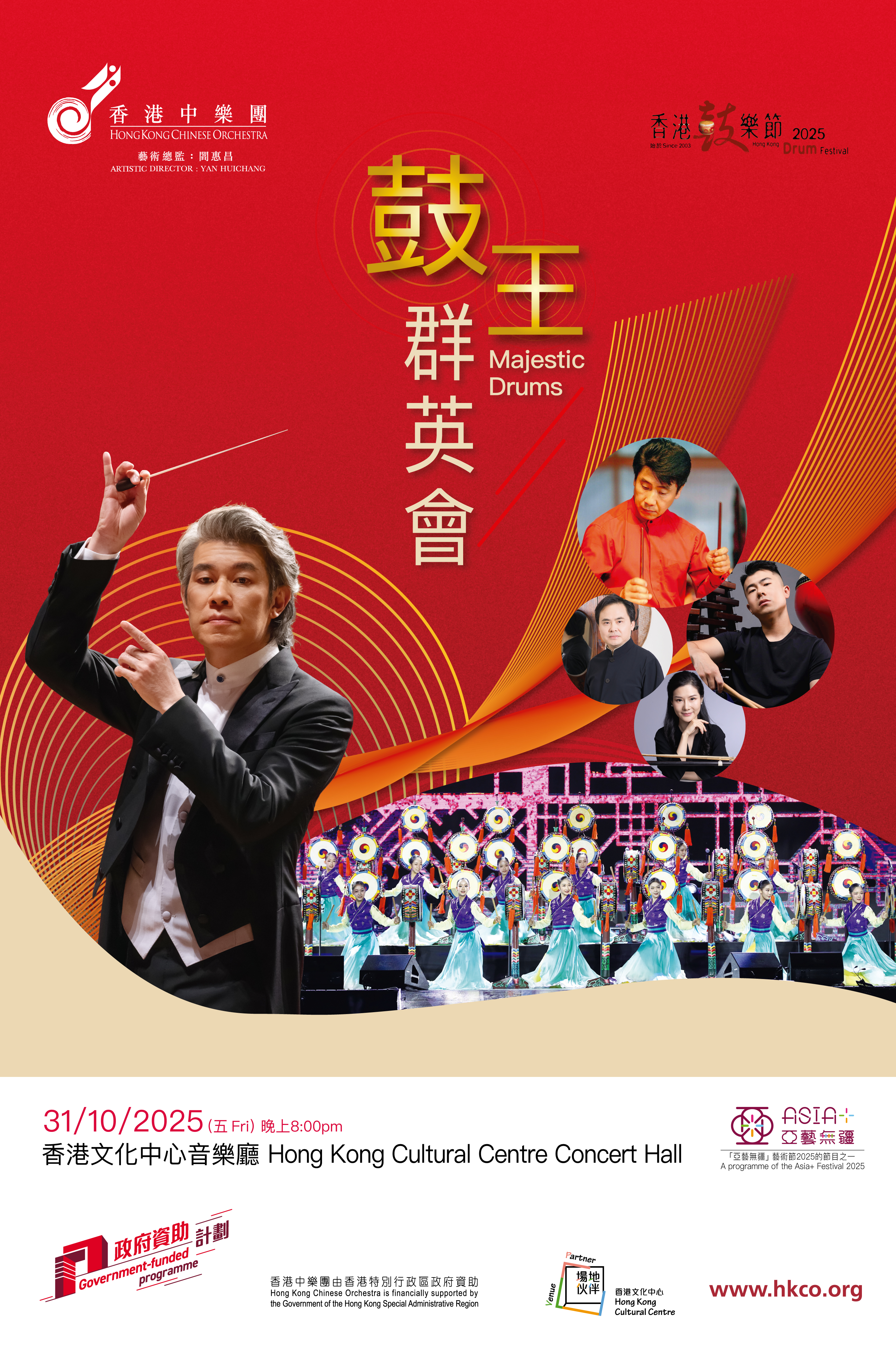 31.10.20252025 香港鼓樂節:鼓王群英會為亞藝無疆2025節目之一周熙杰(指揮) 王建華 (敲擊) 香港中樂團敲擊小組 (敲擊) The Little Angels (韓國鼓舞) 羅弘琛 (敲擊) 魏冠華 (京胡) 劉一歌 (京二胡) | ![]() |