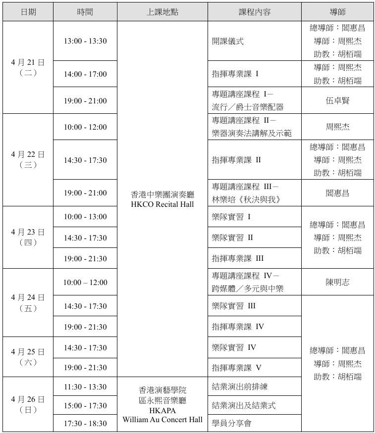 由閻惠昌教授(總導師)及周熙杰先生(導師)親自授課、副指揮兼香港青少年中樂團常任指揮胡栢端先生擔任助教,以大課形式進行,正式學員單獨輪流在指揮台演習所選作品,接受教授直接指導。