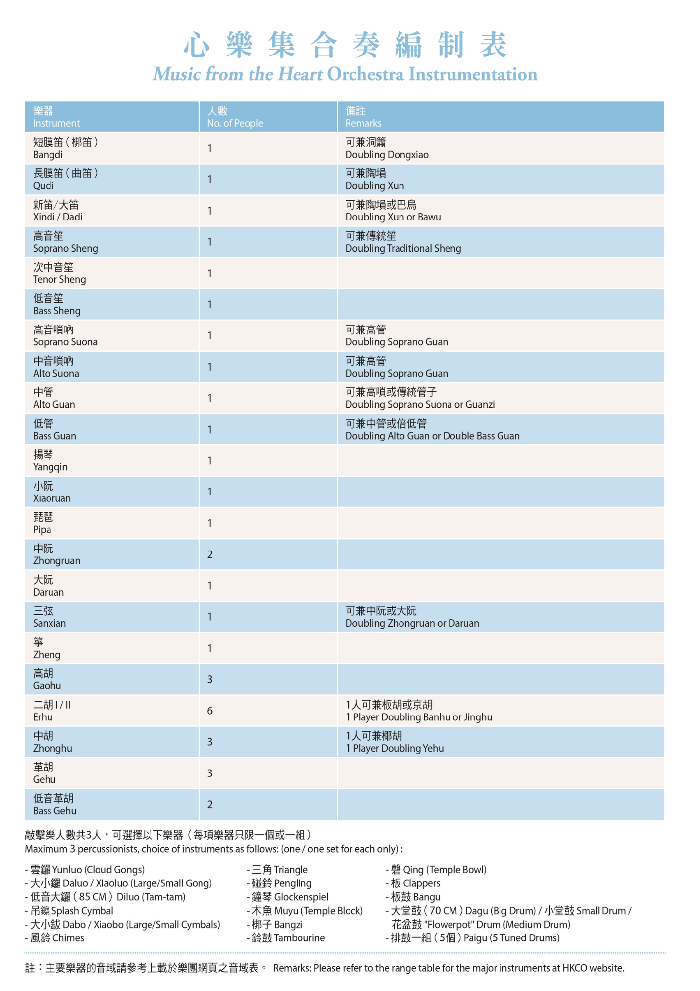 (38人編制,請參閱附表;樂團一般樂器音域表請瀏覽樂團網站常規樂器音域表及總譜格式)